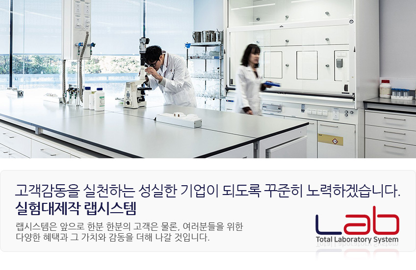 저희 실험대제작 랩시스템은 앞서가는 기술력과 오랜 노하우로 현재 실험실제품 및 실험실기기 업계 선두를 달리고 있는 대표회사입니다. 지난 수년간의 노력과 시행착오를 통해 저희 실험대제작 랩시스템은 고객님들과 더불어 성장 하였습니다.